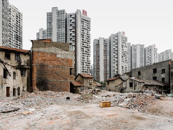 Wuhan Boulevard seizes non-places, in other words transitional spaces which are supposed to be crossed. Probing into social commentary, the series reifies the notion of unqualified city. It allows us to look behind giant advertising panels, unveiling a dreamt city struggling to be completed, a city made of brand-new skycrapers that cohabit with old crumbling housing, a city built to welcome more inhabitants while excluding others. In fact Wuhan is the most populous city in Central China, but it seems its inhabitants have been discarded from these photographs. Where are the people? Only a lone wanderer here and there, or some cloths hung outside testify to the human presence. What is left of their houses then? Are they under construction or being knocked down? Zanoni’s pictures unveil an anxiety about modernization. A sense of dehumanization, of alienation, while enhancing at the same time local attempts to take over these non-places.