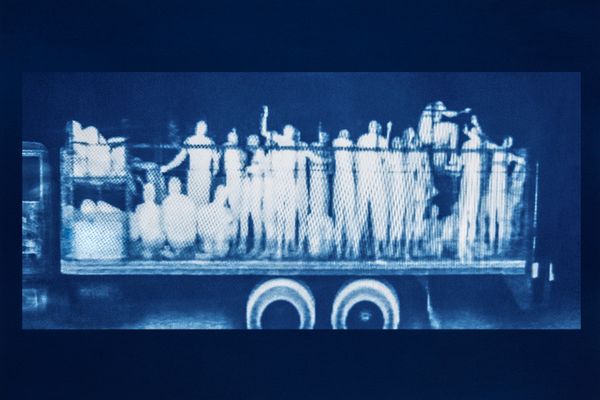 Backscatter Blueprint is a series of cyanotypes that reproduce images of trucks taken using a backscatter x-ray machine, tying this new type of digital imaging to the historical processes of image making developed at the beginning of the modern period. The cyanotype process, having been used to reproduce architectural plans resonates with the elevation-like imagery that the backscatter machine produces, images that reveal a jarring tension between the mechanical trucks and their human cargo.