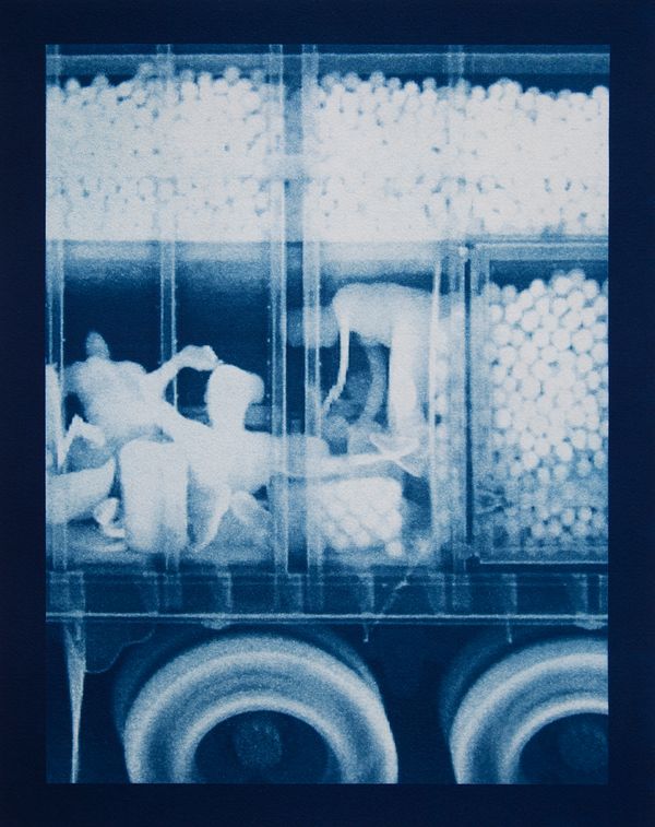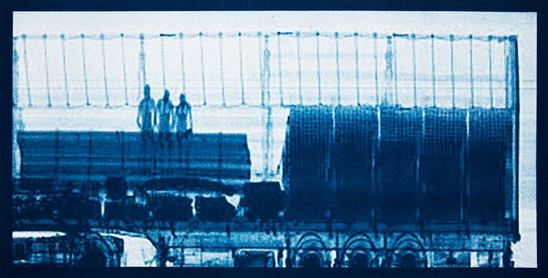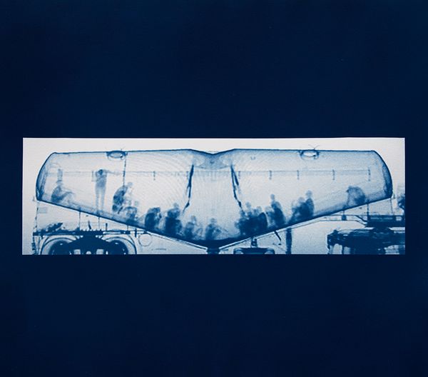 Backscatter Blueprint is a series of cyanotypes that reproduce images of trucks taken using a backscatter x-ray machine, tying this new type of digital imaging to the historical processes of image making developed at the beginning of the modern period. The cyanotype process, having been used to reproduce architectural plans resonates with the elevation-like imagery that the backscatter machine produces, images that reveal a jarring tension between the mechanical trucks and their human cargo.