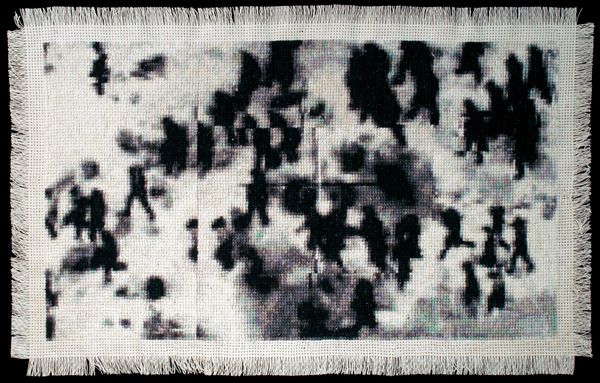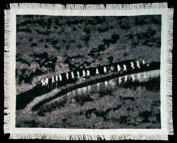Coyotaje is a series of cotton x-stitcheries that depict infrared images of undocumented immigrants crossing the US/Mexico border illegally. Using a computer program the digital files were translated into counted x-stitch maps, and then hand embroidered each stitch representing a single pixel of the original image.