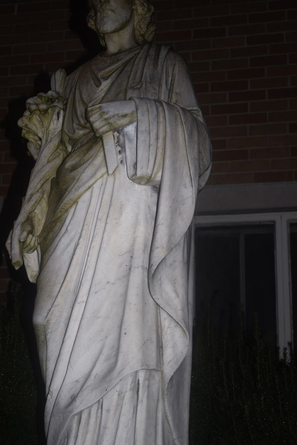 With the borders on "Icon in a Cart" and "Saint," I wanted to draw a parallel between the two as iconography, specifically how a monument may appear on a postcard. There was something about aligning a young Latina with a statue typical of most Catholic churches and producing iconography around her that felt weighty; her body language reads as self-assured while her surroundings offer her nowhere to go.