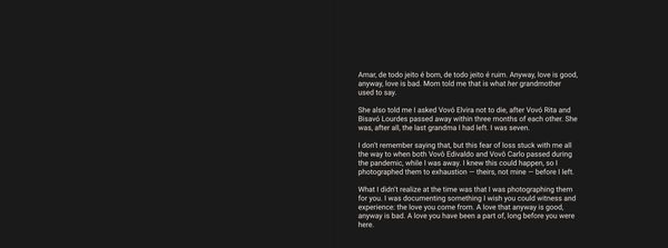 I don’t remember saying that, but this fear of loss stuck with me all the way to when both Vovô Edivaldo and Vovô Carlo passed during the pandemic, while I was away. I knew this could happen, so I photographed them to exhaustion — theirs, not mine — before I left.