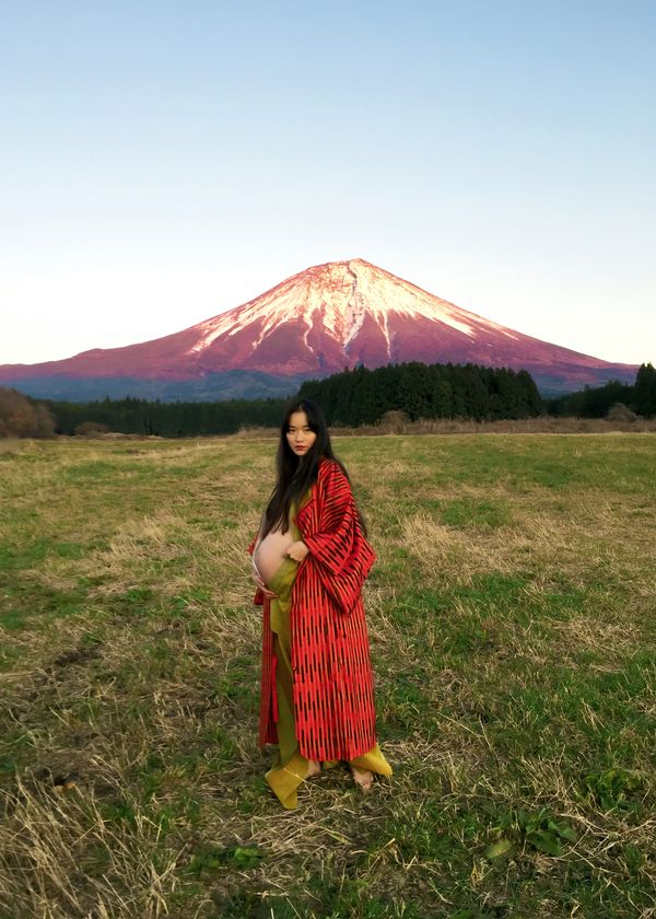 Nami and I, along with our friend Austin who had always been there to help us with the shoot and later taking care of the baby, then started to travel every month to different locations inside Japan to document her journey. We especially went to Fuji a lot since it’s her hometown where she later moved back to. The whole process was spiritually marvelous. Nami had a very intuitive sense of navigation. That’s how we found most settings in nature. We once got lost and because of that we witnessed red Mount Fuji from close, as well as the birthing of a calf on Nami’s birthday, oddly enough her Chinese zodiac sign is Ox.