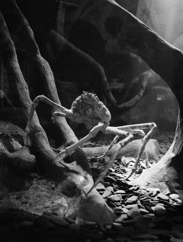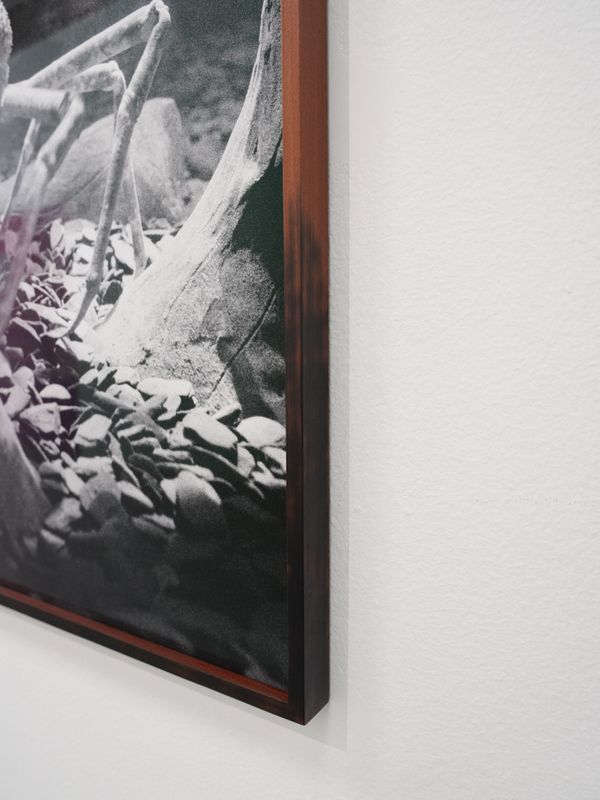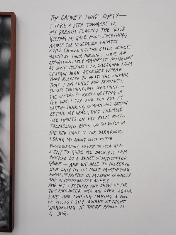 The cabinet looks empty — I take a step towards it, my breath fogging the glass. Keeping my gaze fixed, something amidst the vegetation faintly moves. Crawling, the stick insects manifest their presence like an apparition, they manifest themselves as some pictures do, emerging from certain dark recesses where they receded to nest. The animal that I am longs for proximity, snouts touching, but something — the camera? — keeps getting in the way. I try and try but my earth-sharing companions remain beyond my reach, they linger like ghosts on my film roll, trembling ever so slightly in the red light of the darkroom. I bring my snout close to the photographic paper and sniffle to pick up a scent to guide me back, but I am pricked by a sense of anticipated grief — are we able to preserve life only in its most mortifying form, petrified in museum cabinets and in photographs alike? And yet I return and show up for this encounter over and over again, love and longing making a fool of me, as I stay awake at night wondering if there really is a Dog.