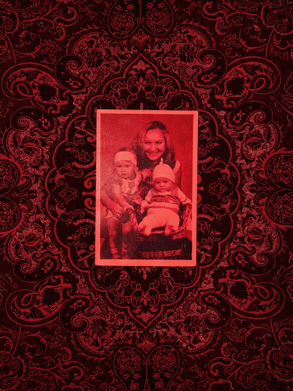 When you look at the record of the disease, you get the impression that you are dealing with a song: groups of photos, like verses, are interrupted by refrains. This construction of the plot corresponds to the course of the disease. Incurable, autoimmune diseases often have this characteristic – the times when wellbeing improves and symptoms become less visible or even regress, and then there are relapses that hit with more and more force. Knowing this specificity, after some time the patient knows what awaits: pain, treatments, medications, suffering... Remissions and progressions – deeper after each cycle. This temporal structure of suffering is part of the project's narrative: the photographs are repeated at various intervals. Pictures are also duplicated – refrains: red images like explosions of pain. Choosing red may seem like a very simple, or even too obvious decision. In the whole narrative, however, this dominant color loses its obviousness - color is suffering of light, blood-red maybe even the most. In this case, the tint touches the hidden meanings of the disease. Here is a childhood photo placed on a patterned background (in real life it is a carpet, but it is not about the floor). Myopathy can be passed on genetically in the family. In this sense, family photos can hide terrible secrets about the future of the photographed people.