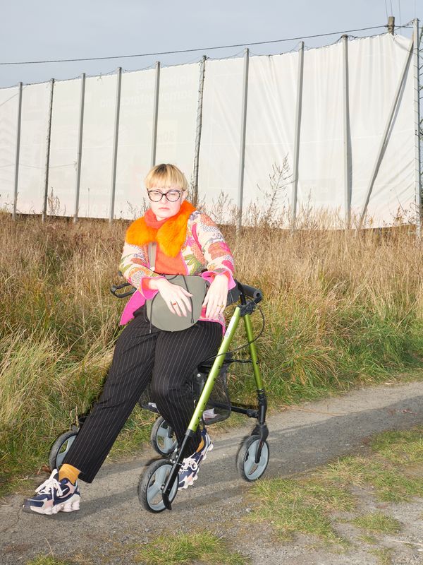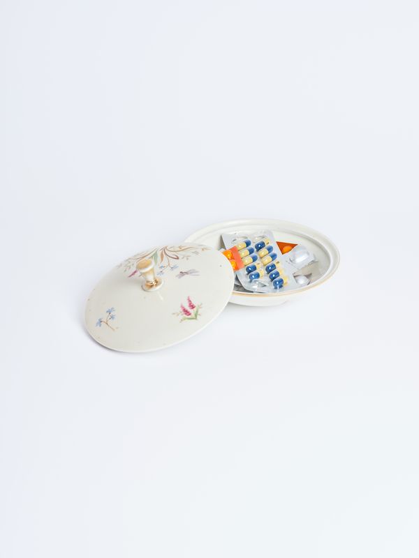 A woman with a walker, an exhausted woman in an armchair, a woman on a stool in the shower, a woman performing an operation on her forearm with scissors, a woman undergoing surgery (her almost naked body is touched by anonymous hands), a woman lying on the bed – with an expression of suffering on her face (the dog lying next to her, watching), a woman lying wearily on the photographic set (a stylish presence: dark glasses, dress, shoes, handbag), a woman with lesions on her face. In addition, mysterious objects: medicine in porcelain, broken nails – were photographed as packshots for an advertising newspaper. The whole thing is bathed in the harsh white light of the flash, which brutally brings out every detail: without fancy compositions, blurring, and crafted lighting to take care of the mood – those sentimental understatements that can be expected in pictures showing disease and pain. However, the photographs from the series are closer to cold medical observations, a scientific typology cataloging the symptoms and behavior of an ill person.