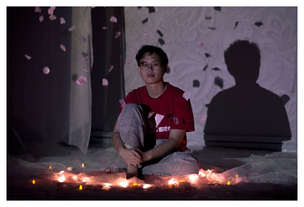 A photography studio. Contemporary love songs play softly in the background. The set is lit by LED panels tinted orange and pink. The floor is covered in white fabric and pink petals. Projected on to the backdrop is an 80s wedding portrait of a man and woman. Other photography equipment – C-stands, light stands, apple boxes, etc. – is placed around the set. In the foreground, two people sit cross-legged on the floor, holding hands, looking at each other. Both have bow ties on. Tears well up, and they embrace. A prolonged pause, then the click of a camera shutter.