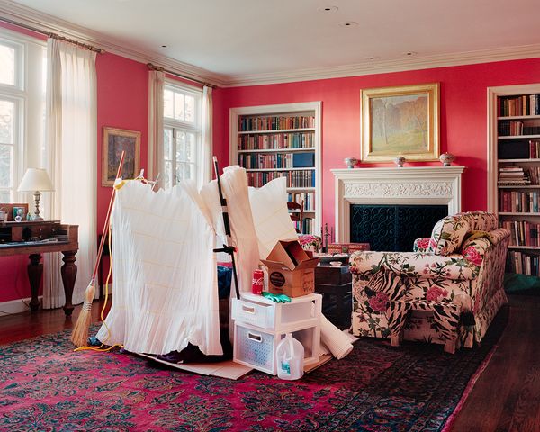 Jana Sophia Nolle’s photo series Living Room, San Francisco (2017/2018) document temporary homeless shelters recreated from materials found in the street and erected in various affluent living rooms in San Francisco. In developing the project, Nolle worked with unhoused persons to understand how their improvised dwellings were constructed. After establishing these relationships, and with the permission of the unhoused individuals, Nolle approached wealthy people for permission to reconstruct these shelters and photograph them in their homes.