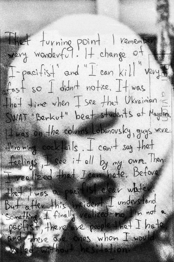 We live in a society in which our visual perceptions are bombarded all the time. Every single day in front of our eyes a huge amount of pictures of war and devastation flows, and we do not seem to feel any kind of feelings about them - we no longer “see” them. The bodies and the faces we keep on ab- sorbing are turning us into alleged unaware voyeurs, and still we remain accustomed to pictures that neither offend us nor urge us to reflect. The paradox of that is we are driven to reflect only when a picture doesn’t show all those war-related elements, such as dead bodies or weapons. With the reportage photographs of my private archives, shot during the Ukrainian war – from the riots in Maidan Square, to the parting of the Crimea, to the war in Donbass fro 8 months– i reconstruct such events with overlaps, cuts and corrosions. The aim is to create a different iconographic repertoire, to revise and to change the way to tell the war, without erasing the historical and cultural roots of such events.
