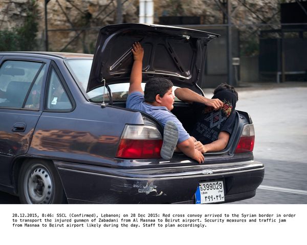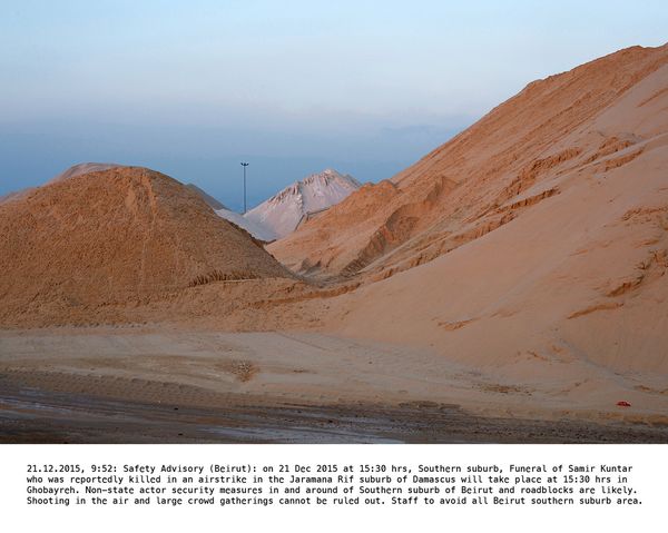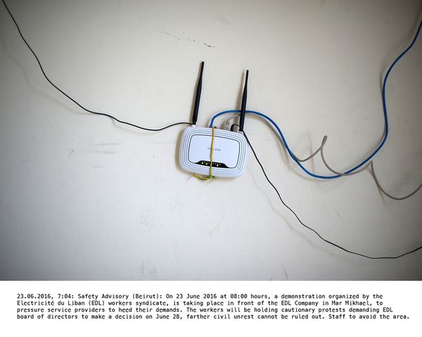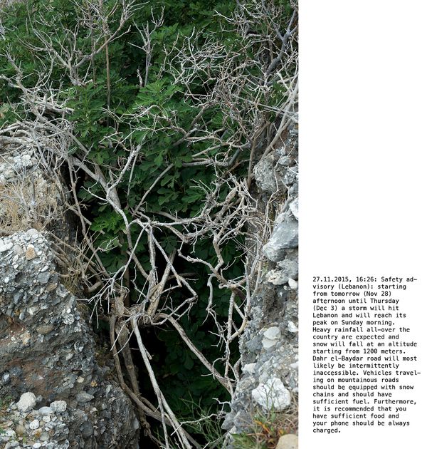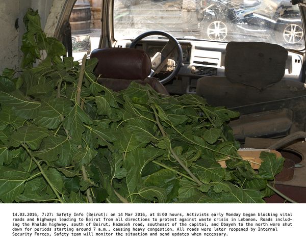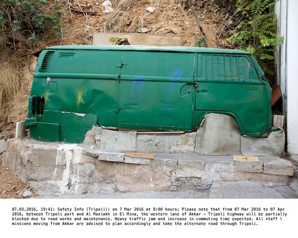 For 10 months I had been receiving messages on my cell phone while working in an international organisation. These messages, vaguely called security updates, arrived several times a day and marked a completely different way of living my life in Lebanon from what I experienced before and after. I decided to look at them closely, read into their codes and keys, and try to relate them to Lebanon that I know. At first glance they seem plain and clear but in reality they conceal in the open the very codes that make Lebanon what it is. My photographs are personal, nostalgic, at times absurd. They relate to traces, objects, landscapes, forming a notebook or