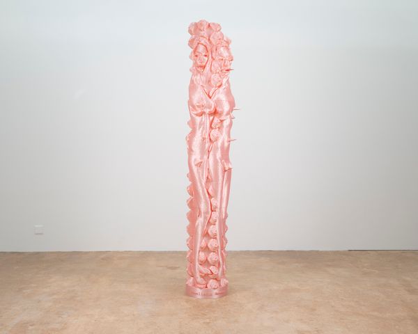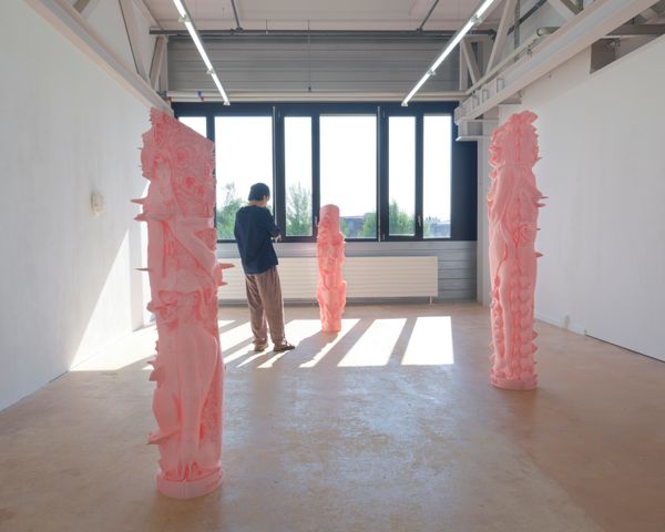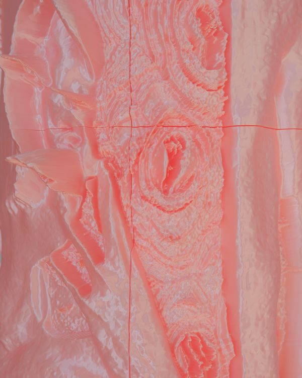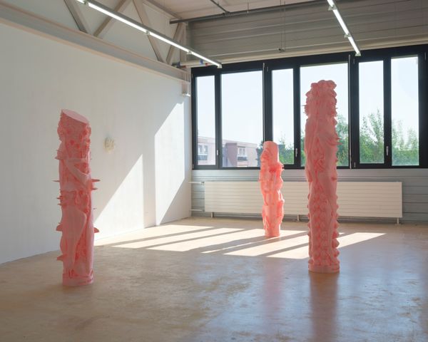 This hybrid workflow, bridging image editing, algorithmic modelling, and sculpture, pushes the boundaries of what an image can become. Digital tools are not used to perfect or beautify form, but to reveal the mechanisms of control embedded within it. The resulting sculptures are glossy pink, monumental, and ambiguous columns that cannot be consumed in a single glance; they must be circled, approached, and negotiated.