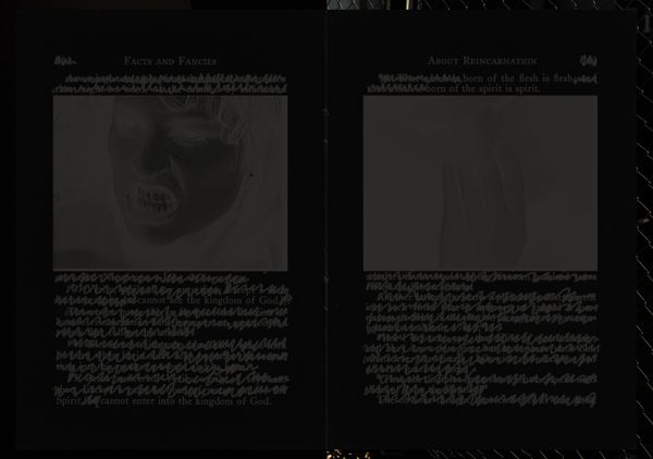 The book combines contemporary photography, Hi8 video stills, and VHS footage to mirror the layered, mediated way spiritual and political ideas circulate. Structured in three sections—learning, death, belief—it transitions from clarity to abstraction, reflecting how deepening conviction often narrows perception. Two additional books are nested within the main volume: one is a redacted reinterpretation of Clara Codd’s The Mystery of Life and How Theosophy Answers It, layered with stills from tantra videos; the other reimagines Astrological Signatures, printed in negative with fragments of astrological text and portrait stills from vintage adult films.